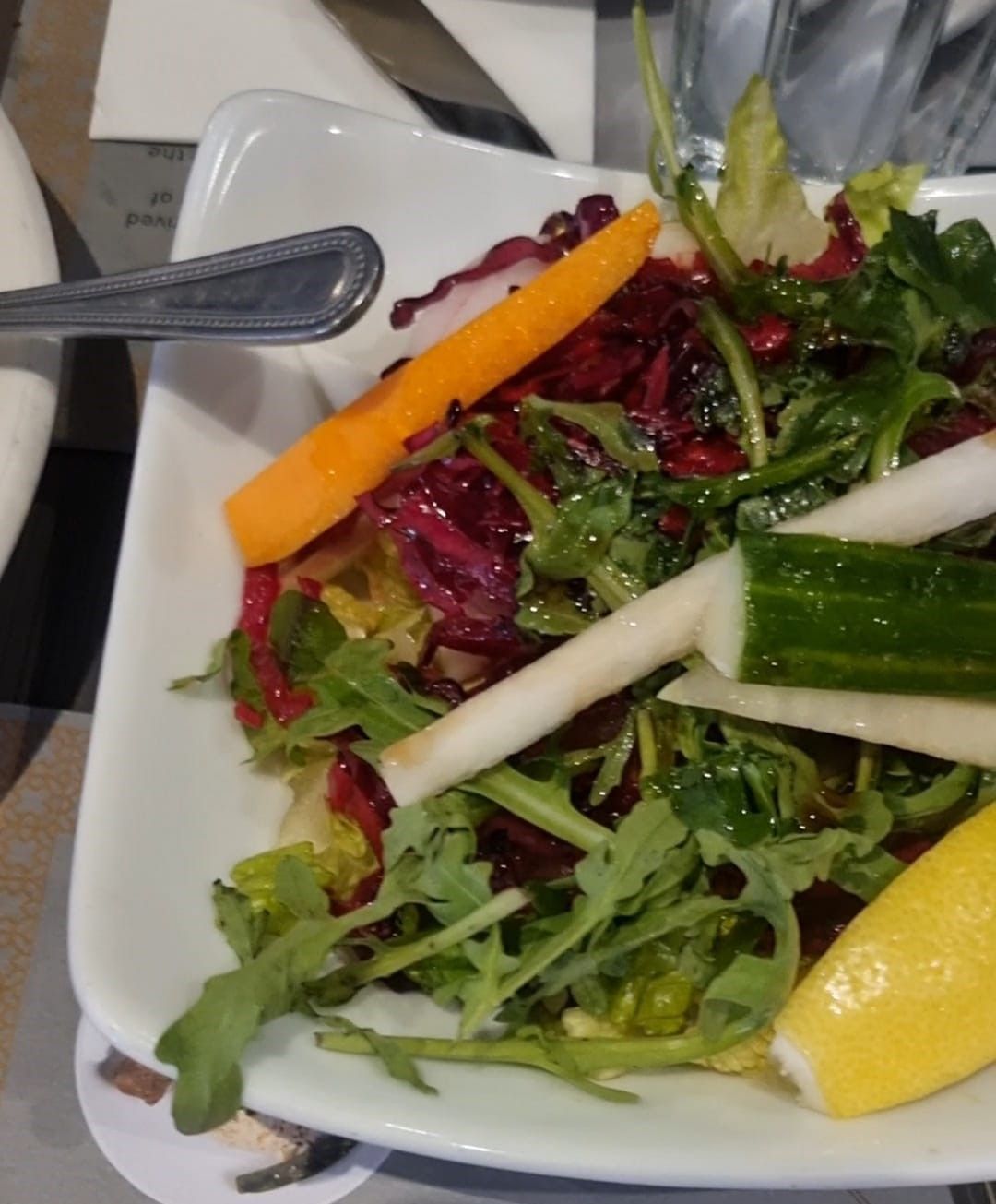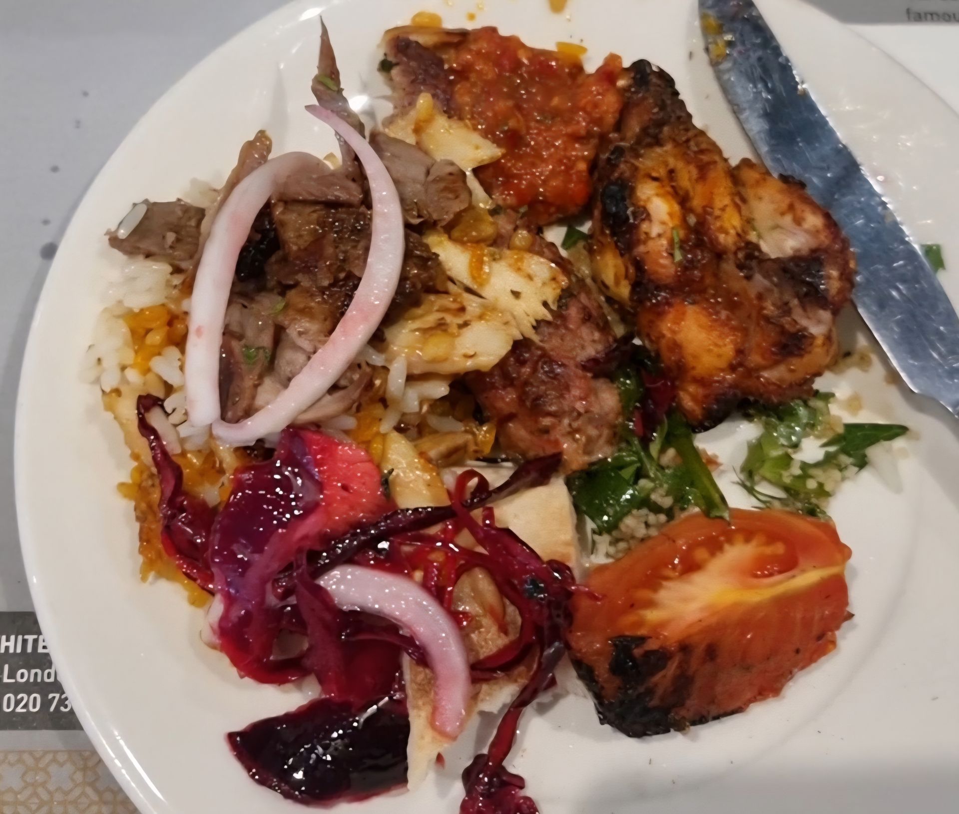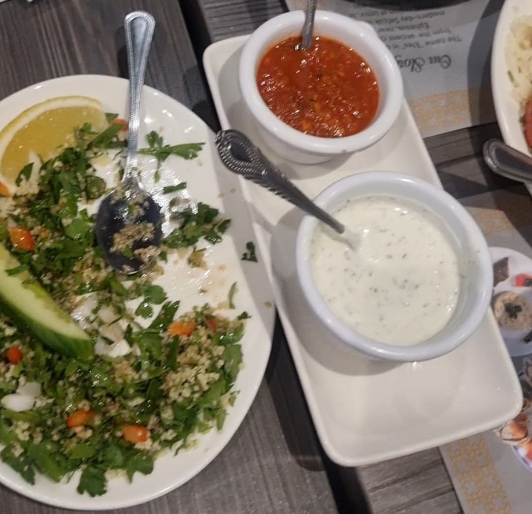 We ordered two salads to accompany our platters – a Tabbouleh and a mixed Mediterranean salad. The Tabbouleh was fresh and finely chopped, with sweet pops of tomato, zingy lemon, and fresh mint. It was a little tart, but in the best way. The second salad came loaded with rocket, red cabbage, cucumber, carrot and crunchy white onions. It had a vinegary kick that balanced out the meal beautifully, and the freshness of the onions really stood out for me – sharp, clean, and not at all overpowering.
